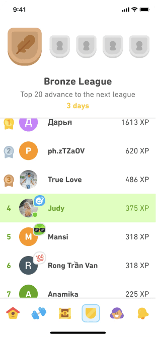 Duolingo features a leveling system, rewards, and customi-zable gameplay.